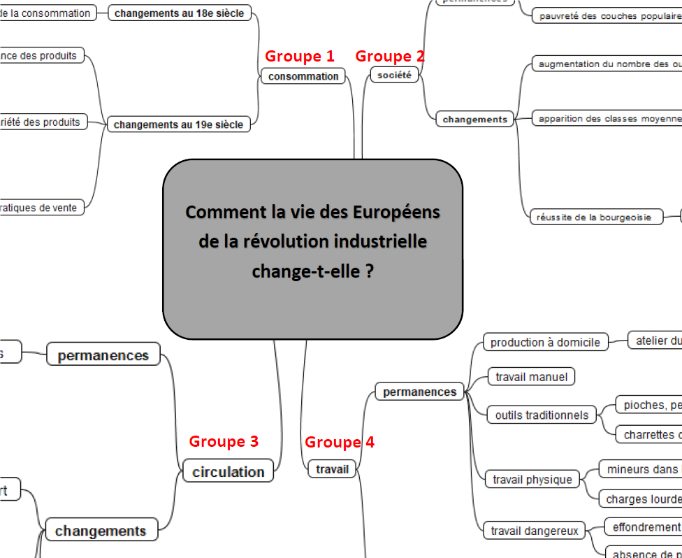 Lors d’une deuxième séance (d’une durée comprise entre une heure trente et deux heures), de nouveaux groupes sont formés, qui sont des groupes d’experts. Chaque « expert » dispose du tableau complété et de la réponse rédigée correspondant au thème qu’il a précédemment étudié. Il peut ainsi présenter les conclusions de ce travail. A l’aide de leur inventaire, qui constitue un écrit intermédiaire, les élèves doivent pouvoir réaliser une carte mentale répondant à la question clé initialement posée : Comment la vie des Européens de la « révolution industrielle » change-t-elle ? En fin de séance, il parait judicieux de questionner et de faire se questionner les élèves sur la pertinence de l’expression « révolution industrielle ».