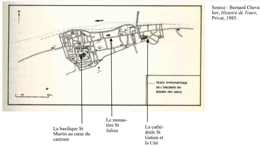 Le cas de Tours permet de mettre en évidence la « floraison urbaine » du XIème siècle au début du XIVème siècle. Il permet notamment de montrer l’un des facteurs du mouvement d’urbanisation. A Tours, c’est à 800 mètres de la Cité que se développe un 2ème noyau urbain autour du monastère de St Martin. Or en Gaule septentrionale entre le VIIème siècle et le IXème siècle, beaucoup de vieilles cités sont revitalisées par leur périphérie dans laquelle se développent de nouveaux établissements religieux, riches et puissants (Lebeccq 1990). Les offrandes des pèlerins, l’afflux des legs testamentaires enrichissent les basiliques. Transformés en monastères souvent fortifiés au IX°, ils deviennent le centre d’organismes économiques, des lieux de vie et d’échanges, des noyaux de faubourg urbains. Le pèlerinage de St Martin est alors l'un des plus populaires.