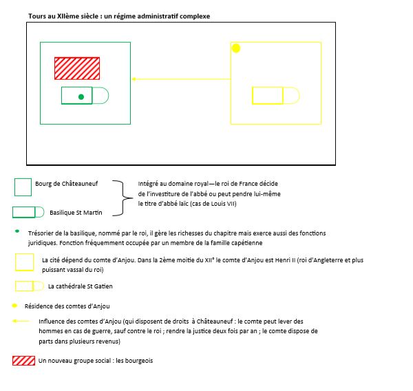 Enfin, dans une dernière partie, il s’agit de constater à travers les différents conflits entre les bourgeois de Tours et les chanoines comment ce groupe social s’affirme au sein d’une imbrication de « forces » en présence. Au XIIème siècle, la Cité dépend du comte d’Anjou (c’est-à-dire Henri II pour la deuxième moitié du XIIème siècle) alors que Châteauneuf (le 2ème noyau urbain né autour de St Martin) est intégré au domaine royal. Sans entrer dans la complexité des différents conflits (analysés par Hélène Noizet et Constanze Buyken), on peut tout de même percevoir la constitution progressive d’un nouveau groupe social qui obtient différentes franchises notamment pour la vente du vin et cherche à former une commune.