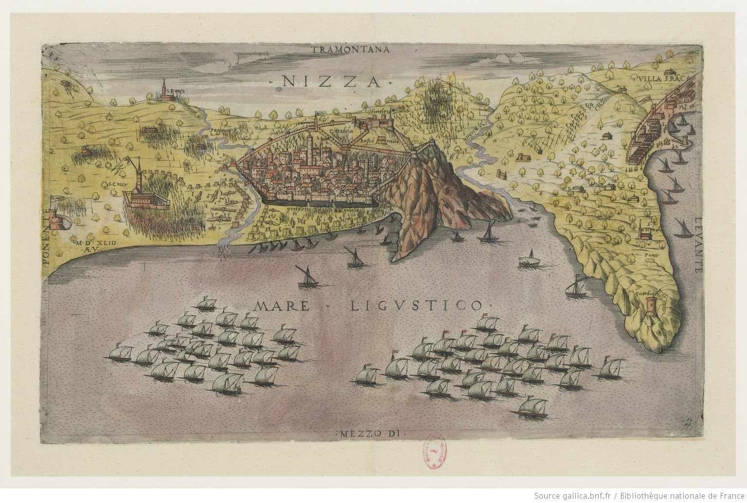 Vue cavalière de la ville de Nice assiégée par la flotte ottoman, 1543, Enea Vico, Paris, BnF.