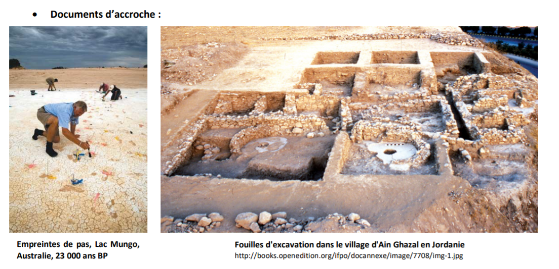 - On peut introduire la séquence sur la Préhistoire par la confrontation de deux sites archéologiques. L’un situé en Australie, daté du Paléolithique, l’autre en Jordanie. Le premier présente des traces de pas vieilles de 23 000 ans BP. Le deuxième, montre les fondations des constructions découvertes.