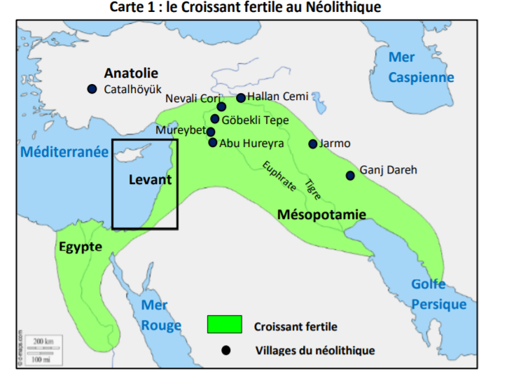• Carte de localisation : Pour la deuxième photographie, une carte de localisation projetée et distribuée en parallèle permet aux élèves de situer le site d’Ain Ghazal dans le Croissant Fertile. Elle sera utilisée pendant le travail proposé lors de l’étude de cas en deuxième partie de séquence.