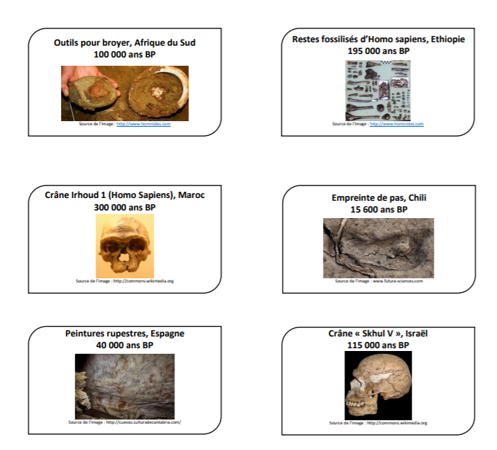 1er temps : Les élèves constituent des groupes de 3. Ils doivent replacer les différentes cartes représentant des exemples de traces humaines sur un fond de carte commun.