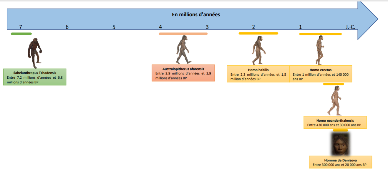 Les élèves doivent replacer les différentes espèces humaines sur la frise vierge. Ils doivent ensuite repérer l’Homo Sapiens et toutes les espèces du genre humain. Cet exercice leur permet enfin de constater que des espèces humaines ont coexisté sur la Terre durant des milliers d’années. Les élèves peuvent rédiger quelques phrases de bilan.
