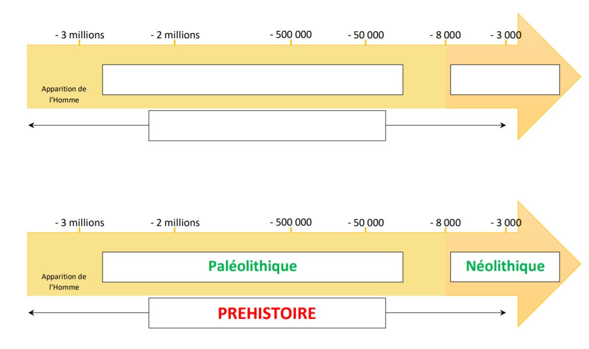 A partir des connaissances des élèves, une frise simple peut être complétée : bornage de la Préhistoire / Paléolithique / Néolithique. La frise peut aussi être finalisée lors de la deuxième partie sur le Néolithique.