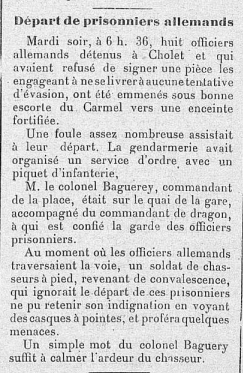 Comment les Choletais réagissent-ils vis-à-vis de ces ennemis hors de combat et comment les prisonniers de guerre allemands vivent-ils leur captivité à Cholet ? Ce double questionnement a été le point de départ de la réflexion menée pendant l’année scolaire 2015-2016 par deux classes de 4ème du collège Trémolières de Cholet. Ce travail a obtenu le label national de la Mission du Centenaire.
