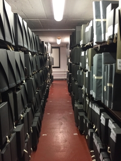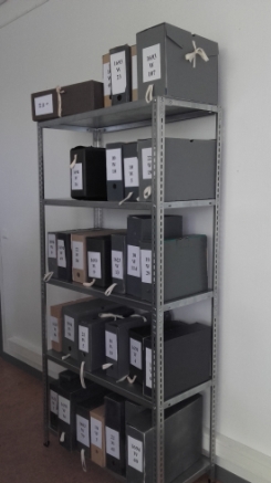 Les rayonnages aux Archives départementales | L'ensemble des 49 boîtes d’archives réalisées par élèves de Troisième et de Première. |