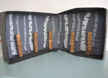 Ensuite, j’ai commencé mon travail en peignant le fond de la boîte en gris, après j’y ai peint les fameux bouleaux en noir et blanc encore avec des tons gris afin de garder cette atmosphère froide, sans vie. Pour insister sur cette atmosphère et pour rappeler Auschwitz, j’ai installé un grillage comme dans les camps qui donne une impression d’enfermement.