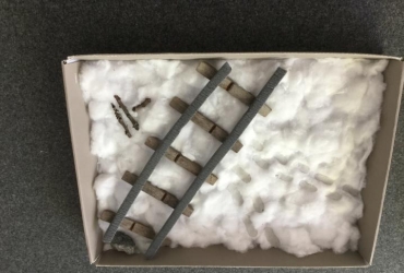 Dans un premier temps, nous avons choisi de réaliser une maquette sur une sorte de plateau, étant donné l’impossibilité d’utiliser la boîte comme support. Sur ce plateau, nous avons installé des rails pour représenter l’arrivée des déportés à Auschwitz-Birkenau. Avec l’absence de wagon et de toute civilisation, nous appuyons sur le fait que ce voyage infernal était leur destination finale. Ces futurs condamnés n’avaient aucune idée de l’endroit où ils se rendaient ni de ce qui les attendait là-bas. De plus, les rails sont la première chose que nous avons vue en arrivant sur place, c’est donc un élément important à nos yeux.