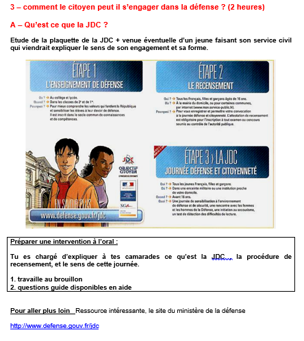 3- la troisième séance place l’élève au centre du dispositif d’engagement, sur ses responsabilités de citoyen avec la JDC et sur ses responsabilités au sein du collège dans la mise en place du plan Vigipirate. Ils mènent une enquête sur le dispositif de prévention puis diffusent l’information dans les classes.