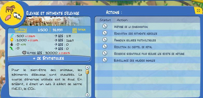 Le site EducTice de l'institut français de l'éducation propose un regard critique sur le jeu. On pourra s'y référer et notamment intégrer le fait que le Clim'way ne propose quasiment que de bonnes solutions. Ainsi, un élevage de bovins ne peut qu'évoluer positivement au regard du développement durable et ne peut donc aller vers plus de productivisme et de concentration (voir illustration ci-dessous). Cette limite doit être appropriée par les élèves.
