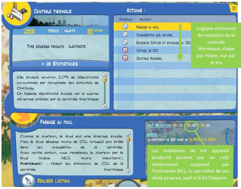 Cependant, en changeant d’échelle et au niveau national, la fermeture annoncée des 10 centrales charbon remplacées par des tranches fonctionnant au gaz (il ne restera plus, à l’horizon 2016, que celles de Cordemais et du Havre pour EDF), suit le modèle du jeu. Cette stratégie répond à la Directive européenne IED, de réduction des émissions de gaz à effet de serre du secteur industriel.