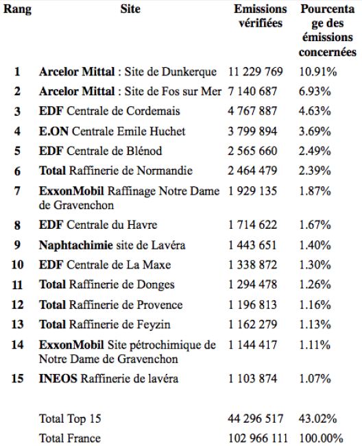 Un tableau de l’ORES sur la répartition des émissions de GES par secteur et par département en kteqCO2 en 2012 montre sa part importante dans la région Pays de la Loire. Situation corroborée par une analyse Médiapart et sa liste des 15 premiers sites industriels émetteurs de CO2 en France (ci-dessous).