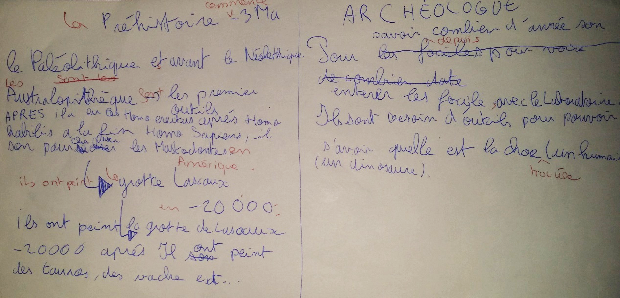 Le cours suivant, la réécriture est relancée par un travail collectif. Les élèves me donnent les informations qu'ils jugent indispensables au récit, ce qui permet la discussion et le tri entre informations nécessaires / informations hors sujet / informations erronées. Ces informations sont classés dans un tableau à deux colonnes : " préhistoire " et "archéologues ". Voici le 2ème jet du même élève (en rouge mes interventions) :
