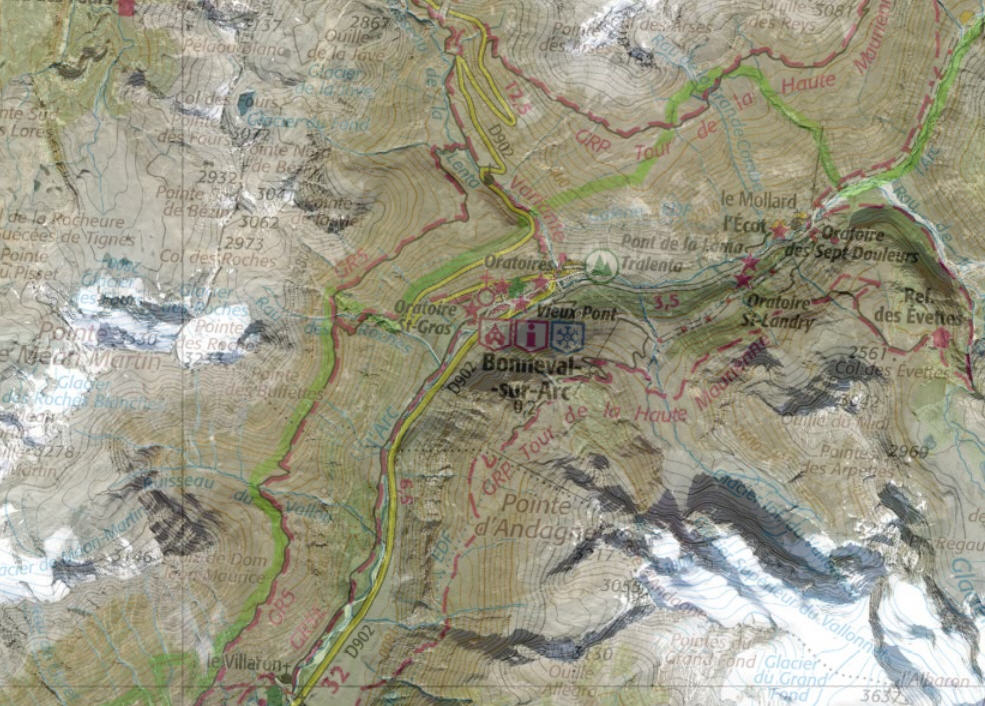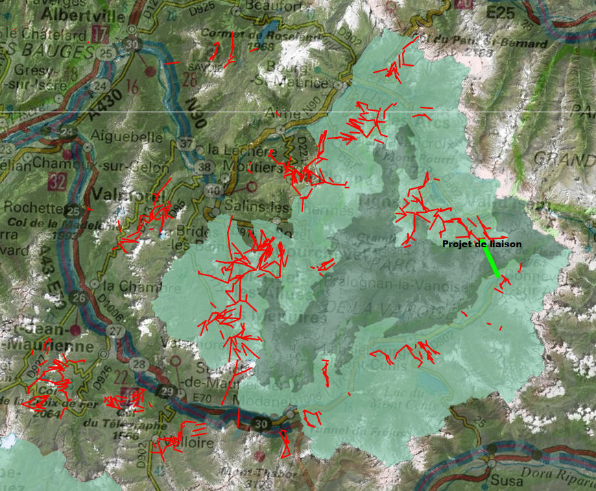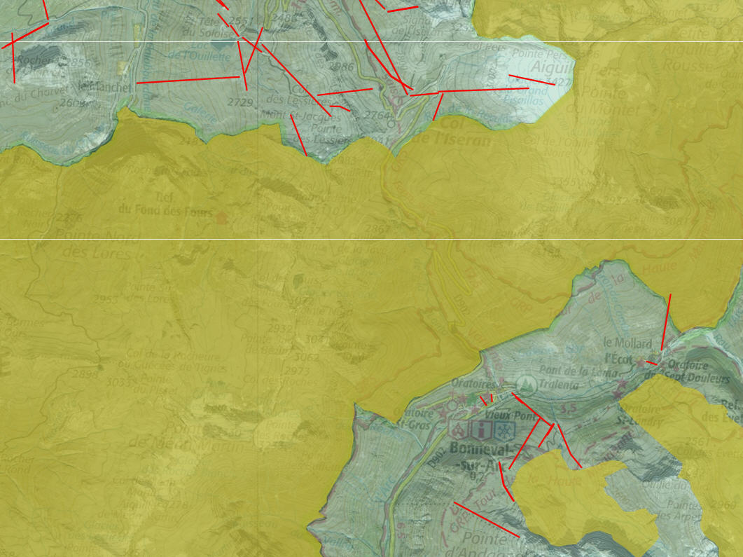 A contrario les infrastructures de transport de Bonneval-sur-Arc sont bien plus limitées et de plus la station est contrainte par la zone natura 2000 en jaune sur cette vue.