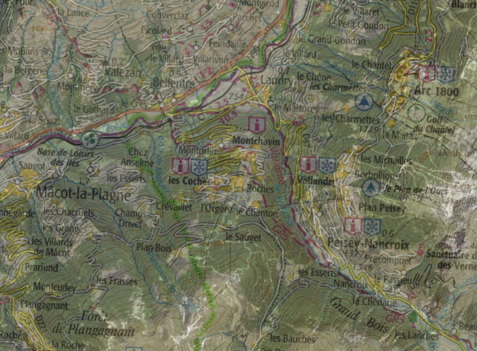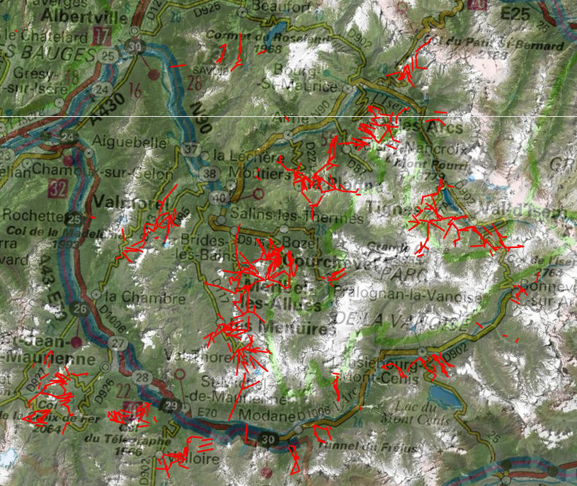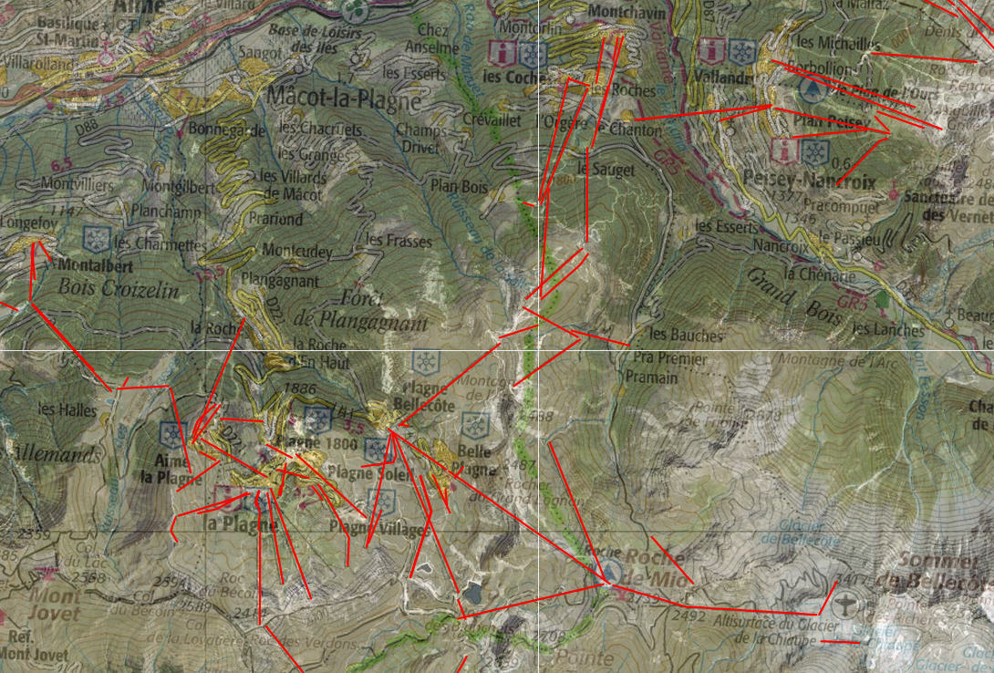 Source : édugéo En rouge s'affichent tous les transports par cables identifés comme tel par l'IGN. Une montagne très aménagé avec trois domaines skiables identifiables : Paradiski, les Arcs et l'espace Killy.