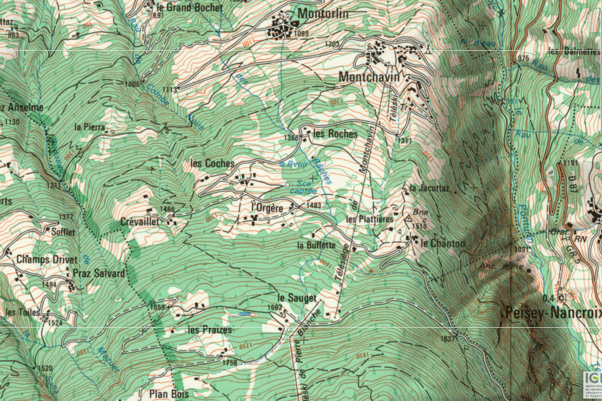 On repère sur cette carte les premières remontées mécaniques qui relient le village de Montchavvin au domaine skiable.
