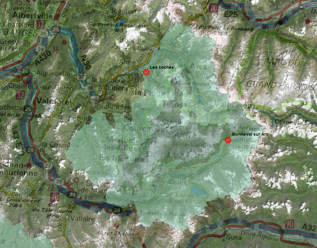 Les Coches et Bonneval apparaissent comme deux stations en bordure du parc de la Vanois. L'une est récente dans la vallée de la Tarentaise, l'autre plus ancienne dans la vallée de la Maurienne.