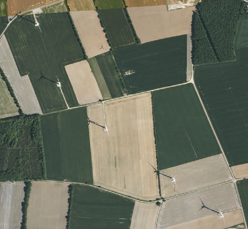 On observe sur la photographie récente de l'IGN de l'implantation de 6 éoliennes au sud de la commune.
