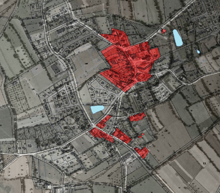 L'emprise du village en 1952 apparait en rouge sur la photographie la plus récente prise par l'IGN.On repère un habitat de type pavillonnaire, de nouvelles rues, des équipements nouveaux (terrain de foot) ont transformé le petit village breton.