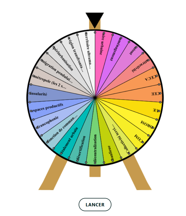 Cette roue de la Fortune permet de jouer avec les connaissances du programme de Géographie de 3e. Le principe est simple : les élèves, chacun à leur tour, lancent la roue et doivent présenter ce qu'ils savent du mot qui est sélectionné.