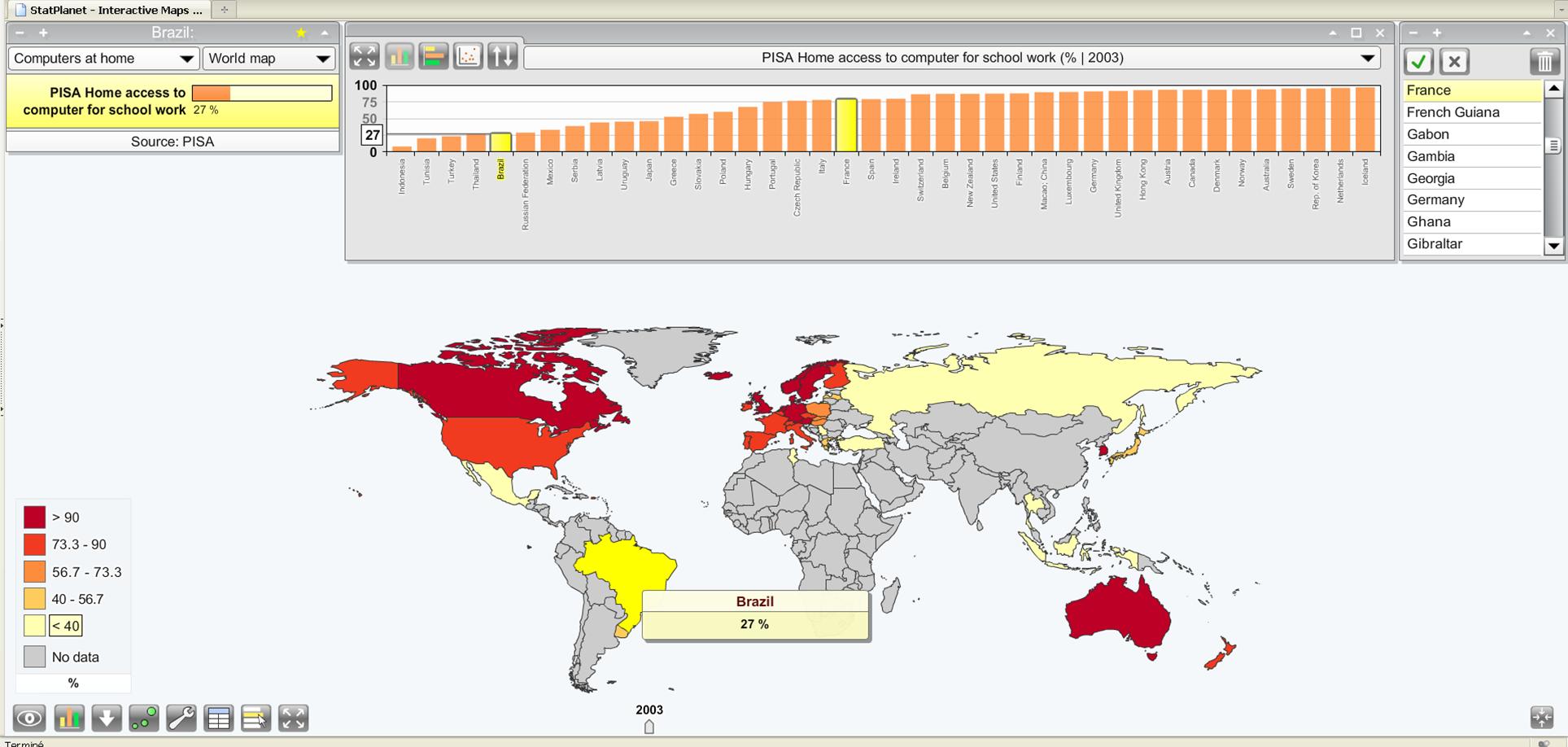 Le logiciel StatPlanet se présente sous forme d'une carte accompagnée de plusieurs petites boîtes-outils, qui peuvent être masquées d'un simple clic (figure 1). Des zooms peuvent être faits sur la carte (option très utile pour la vidéo-projection). On peut aussi exporter facilement les cartes réalisées. A noter qu'il est également possible de cartographier ses propres données.