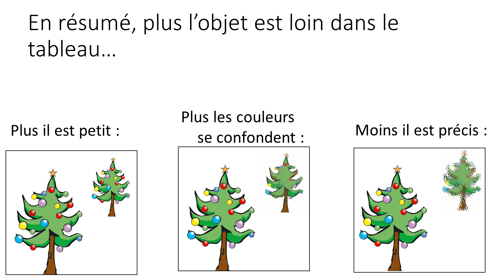 La perspective, en ce qui concerne la Peinture, se divise en trois parties principales, dont la première consiste en la diminution de [...] la dimension des corps selon leurs diverses distances. La seconde est celle qui traite de l'affaiblissement des couleurs des corps. La troisième apprend à marquer plus ou moins les termes et les contours des objets, selon que ces objets sont plus ou moins éloignés [...]