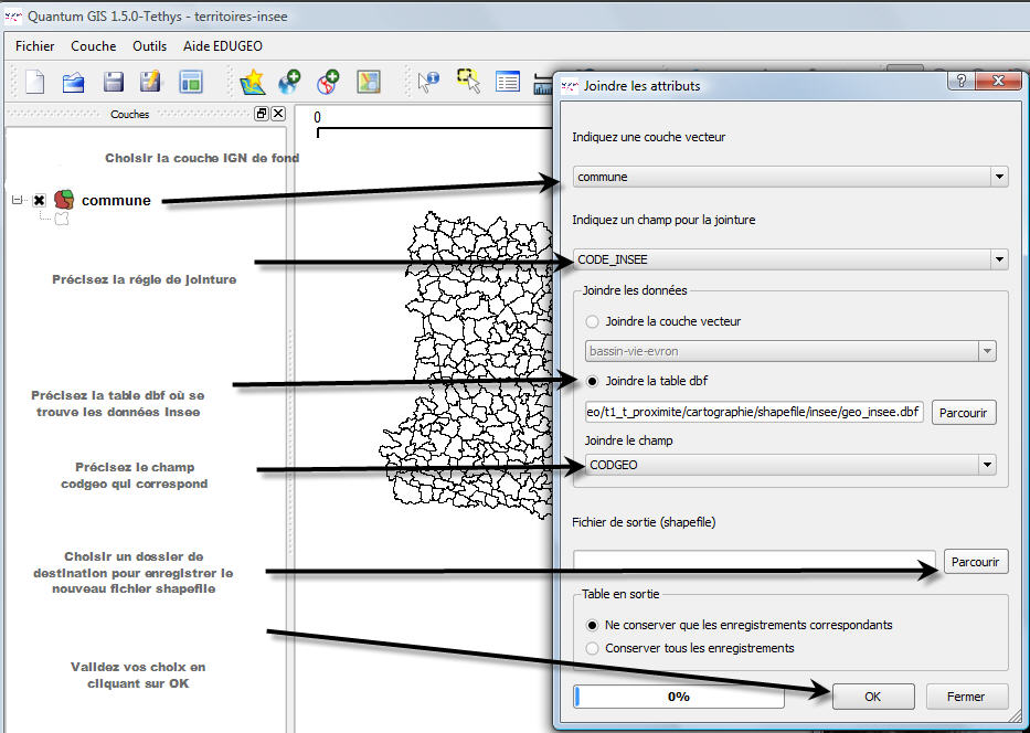 Si vous choisissez l'option « Ne conserver que les enregistrements correspondants », seules les communes auxquelles une ligne de la table .dbf a pu être liée seront conservées.