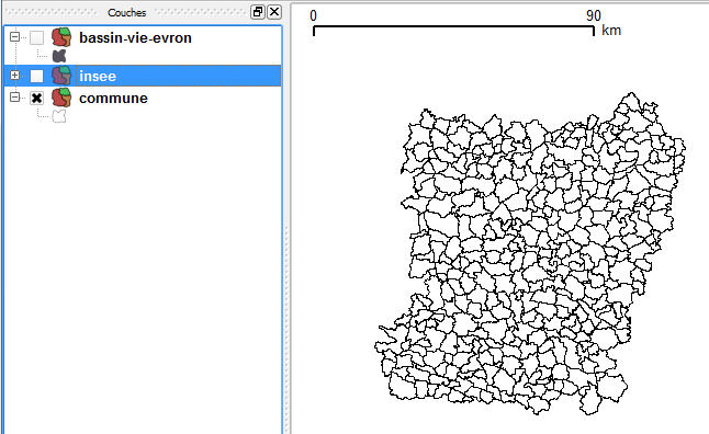 Il vous reste maintenant à spatialiser les données : par exemple en faisant apparaître les communes appartenant au même bassin de vie soit par une requête soit par les fonctions de discrétisation.
