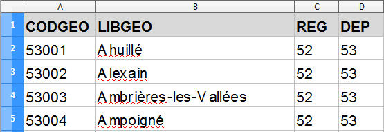 Observez dans un tableur les données Insee, repérez la colonne qui contient les identifiants géographiques.