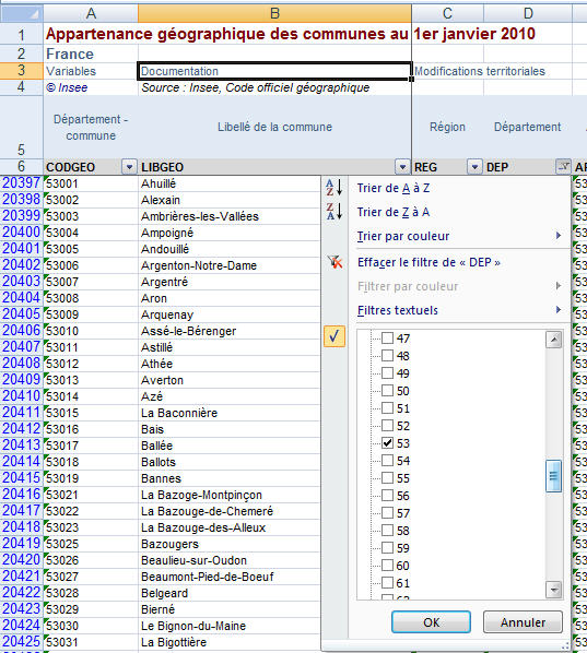 Dans cet exemple, le tri demandé me permet d'extraire les données du département de la Mayenne.