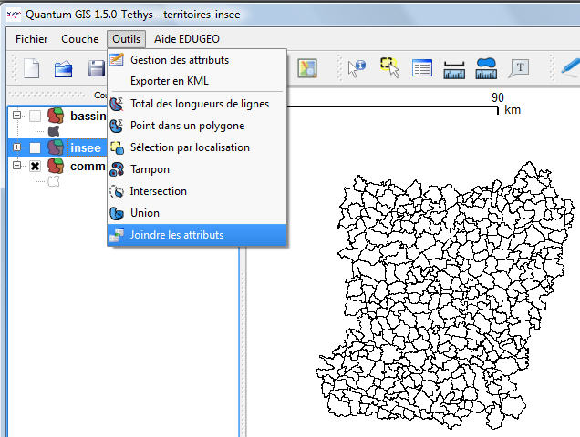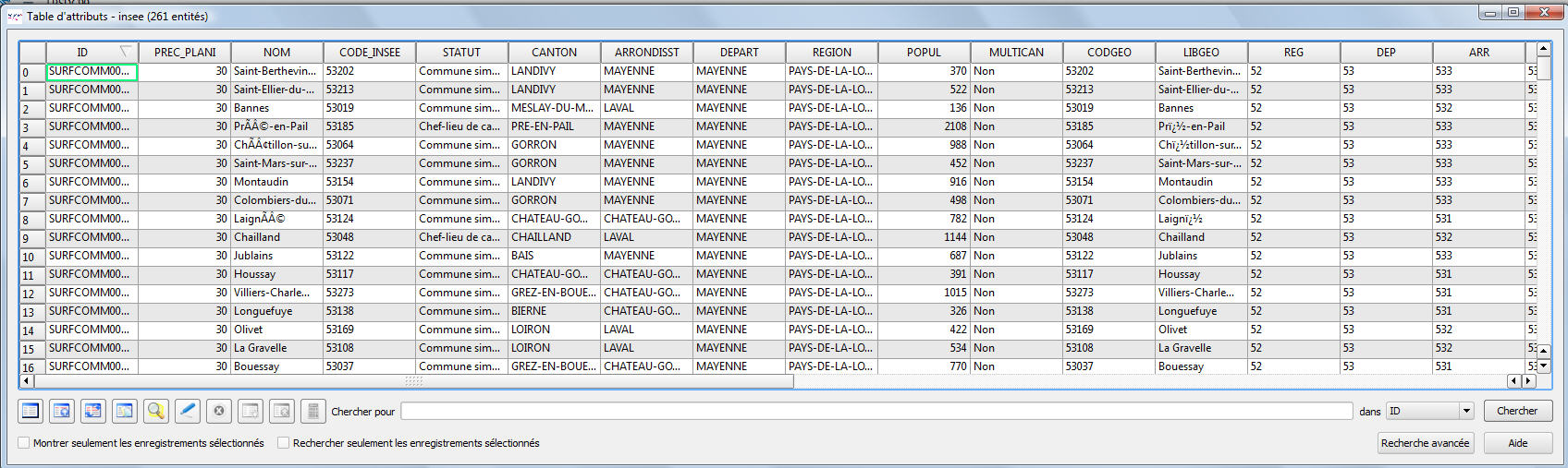 Puis dans Qgis, ouvrez la table attributaire de la couche communes.shp et faites le même travail.