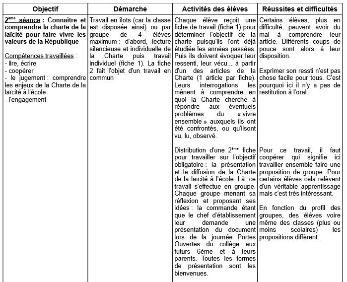 Une proposition pour construire la notion de laïcité de la 6ème à la 3ème à partir de la Charte de la laïcité.
