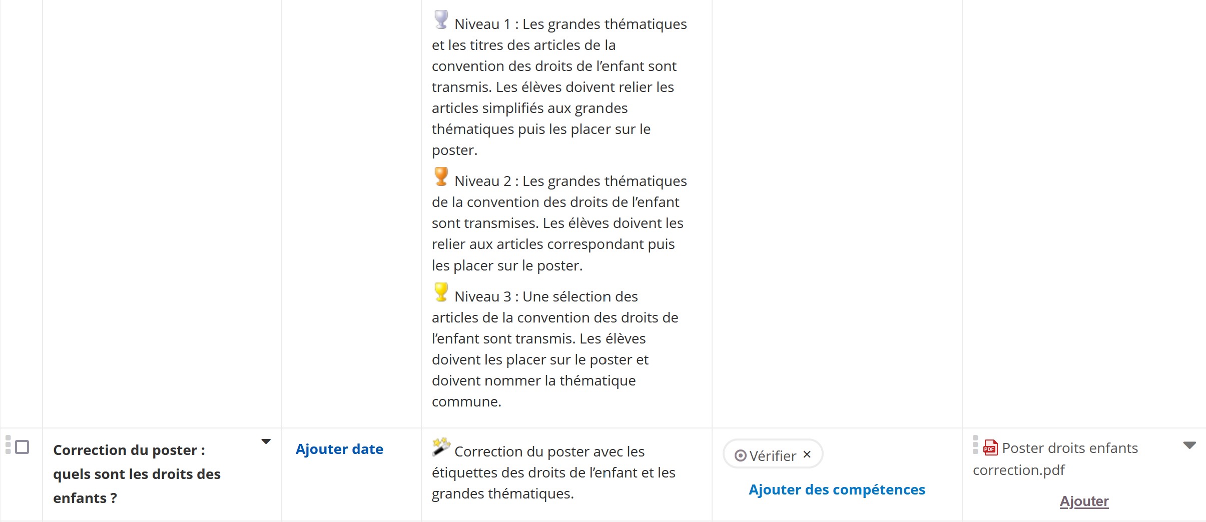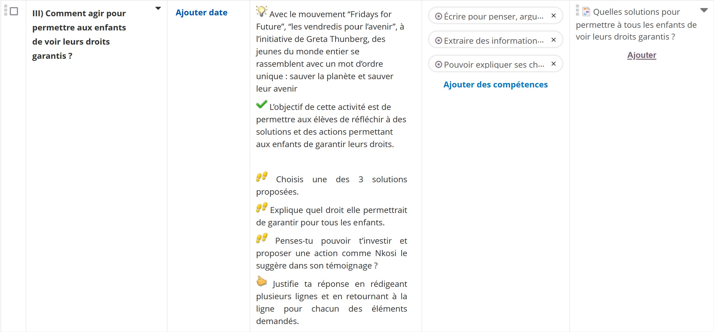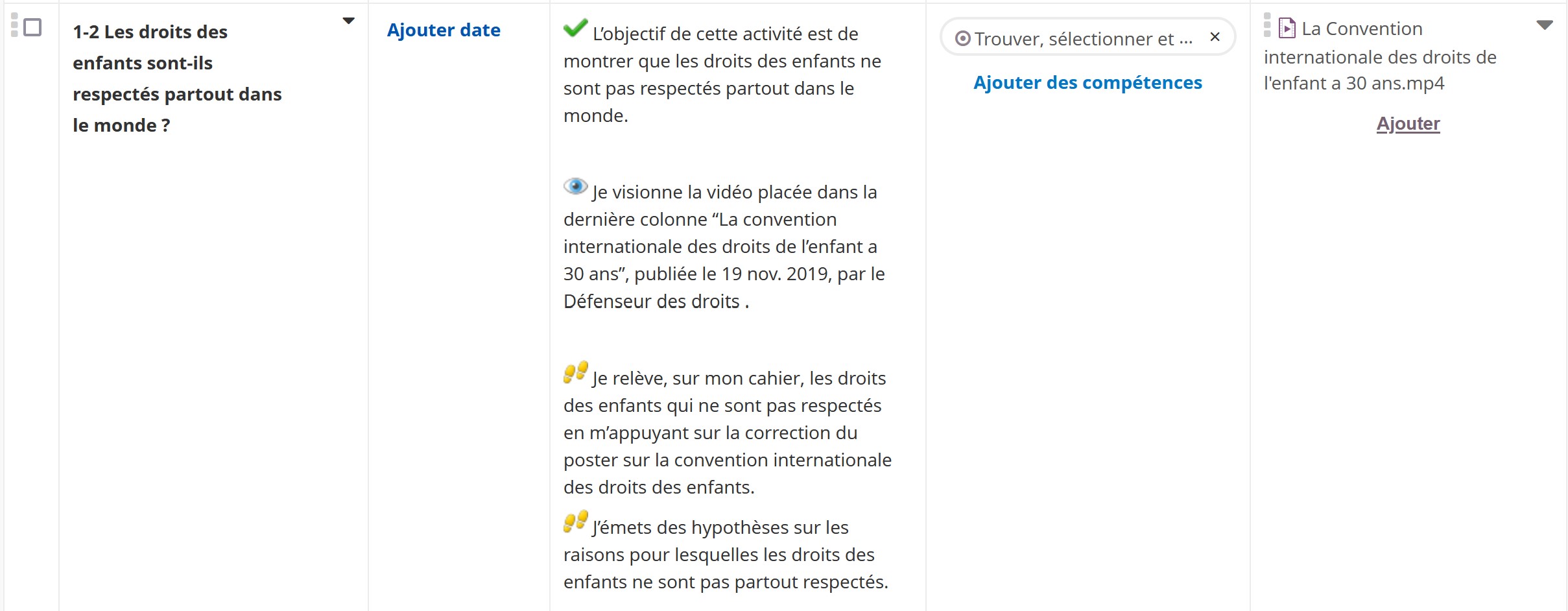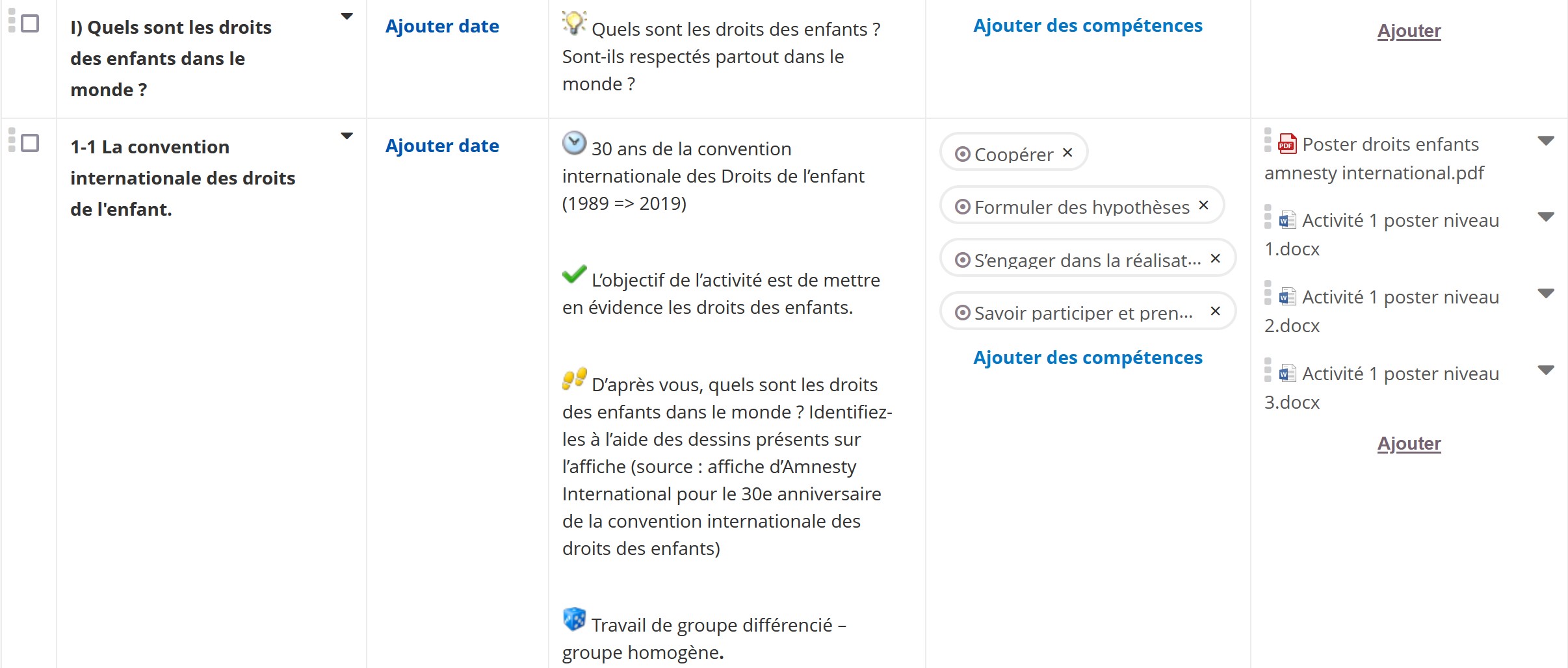 Cette première partie est travaillée à partir d'un poster célébrant les trente ans de la convention internationale des droits des enfants. A partir d'une manipulation d'étiquettes, les élèves définissent les principaux droits. Ils s'interrogent ensuite sur le respect de ces droits à l'échelle nationale et internationale.