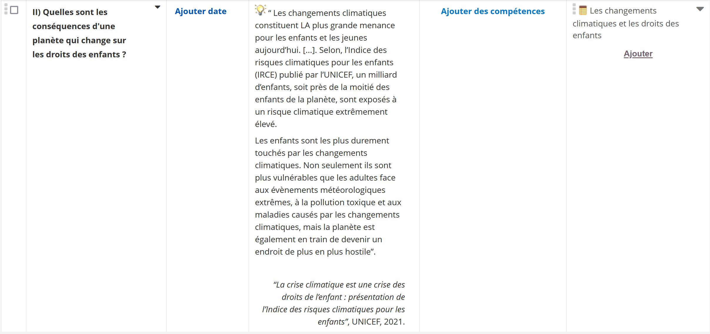 “ Les changements climatiques constituent LA plus grande menance pour les enfants et les jeunes aujourd’hui. [...]. Selon, l’indice des risques climatiques pour les enfants (IRCE) publié par l’UNICEF, un milliard d’enfants, soit près de la moitié des enfants de la planète, sont exposés à un risque climatique extrêmement élevé.