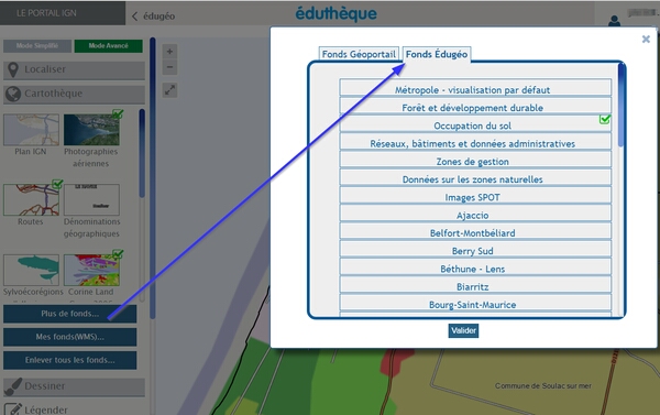 Pour cela il faut sélectionner dans l'onglet Fonds édugeo "Occupation du sol" : parmi les couches qui s'affichent alors, cochez uniquement Corine Land Cover.