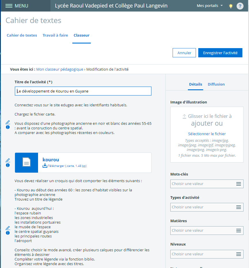 Copie d'écran cahier de texte numérique Pour visualiser les croquis élèves, il me suffit de partager mon écran en deux parties : à gauche l'interface d'e-lyco et le travail d'un élève : un glisser déposser de sa carte dans edugeo suffit à visualiser son croquis. Je peux donc écrire ensuite les élements d'appréciation de son croquis (respect des consignes, bonne lecture des documents, choix sémiologiques etc...).