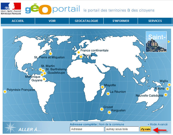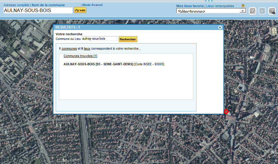 copie écran Après avoir saisi le nom de la commune et cliqué sur le bouton J'y vais, j'obtiens la vue suivante :