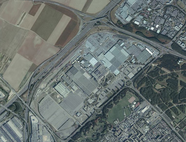 copie écran Le géoportail propose une photographie aérienne centrée sur la commune d'Aulnay sous bois. Il faut ensuite chercher un peu pour trouver l'usine PSA... Vu du ciel, rien ne ressemble plus à une usine qu'une autre usine. L'usine est située le long de l'A1 ce qui permet de la repérer :