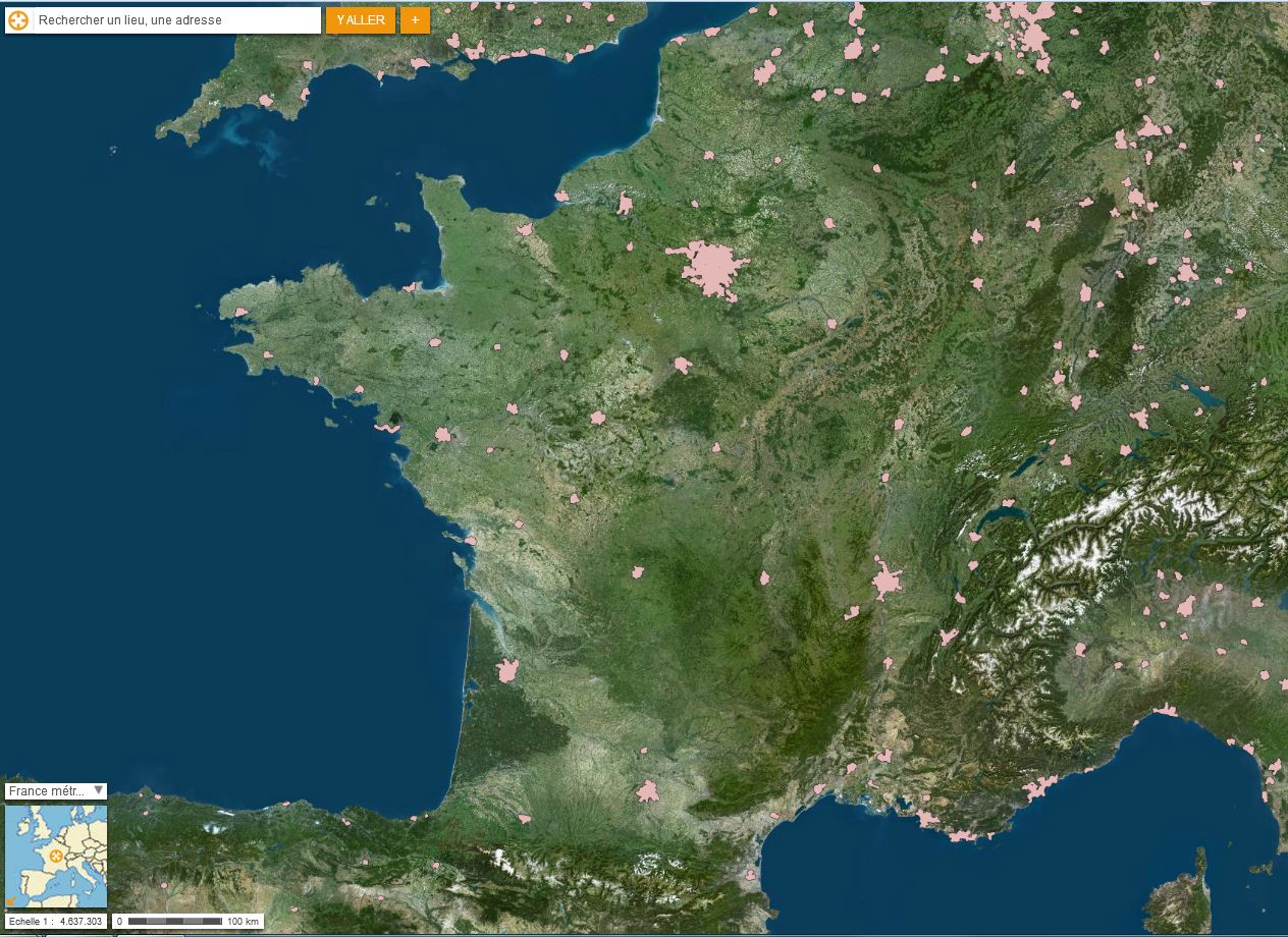 En salle multimédia, on demande aux élèves de se connecter sur le géoportail. Puis il suffit de sélectionner dans le catalogue de couches les données Bâtiments pour voir s'afficher l'emprise spatiale des aires urbanisées.