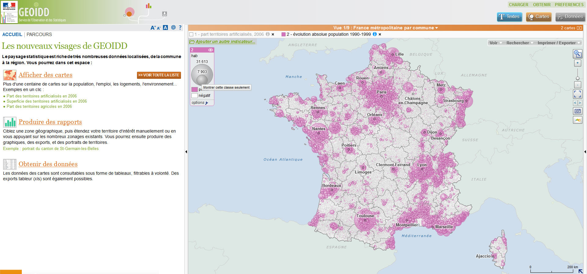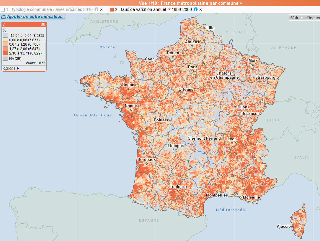 L'avantage pour le professeur est de pouvoir mobiliser dans une même interface différentes couches d'information en restant à la même échelle (en l'occurence l'échelle nationale) de passer d'un onglet à l'autre pour montrer le phénomème de métropolisation, de littoralisation ou bien encore la dévitalisation de certains territoires (ruraux ou bien en déshérence industrielle).