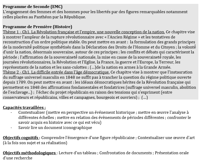 2) Évaluation sommative : Application sur un autre exemple local : comprendre la place d’une figure républicaine : exemple de la statue du général Chanzy au Mans (voir la ressource ici) : usage des notions du thème ; usage du langage iconographique.
