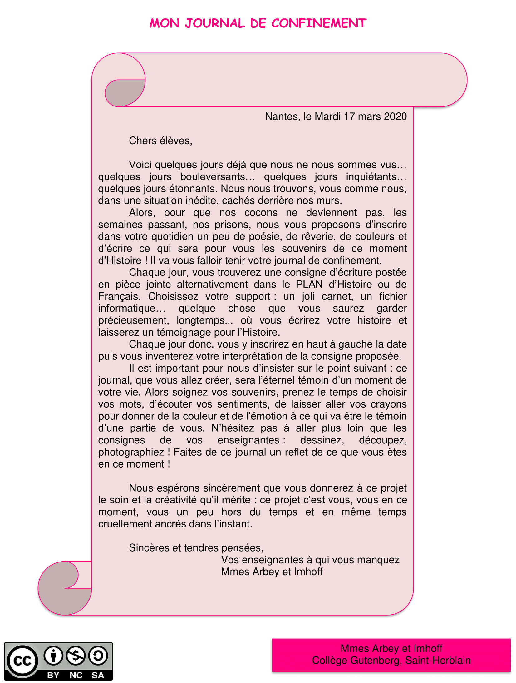 Deux enseignantes proposent aux élèves de leur établissement d'écrire un journal de confinement. Au fil des jours, ils écriront leur histoire et laisseront un témoignage pour l'Histoire.