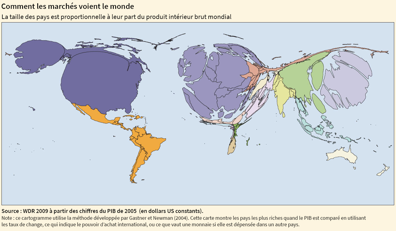 Planisphère par anamorphose de la part des pays dans le PIB mondial, source : Banque mondiale
