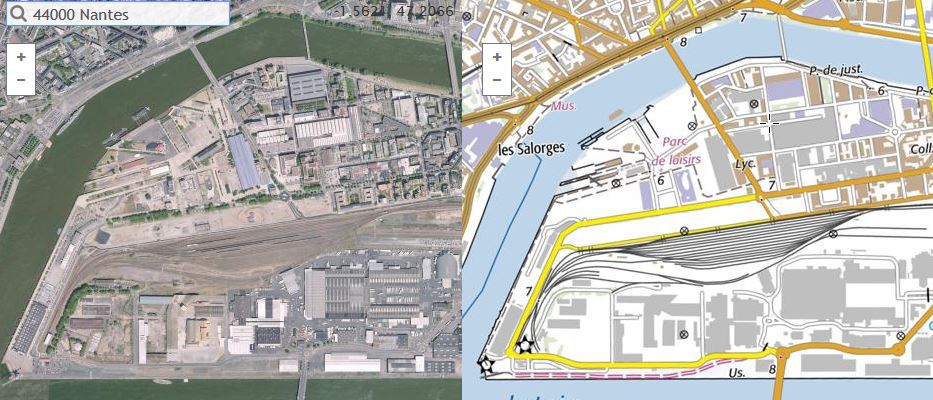 - Le double affichage : deux ressources du même espace sont ici juxtaposées afin de permettre leur comparaison (sur le mode de l'interface du site Vueduciel du Conseil Départemental de Loire-Atlantique).