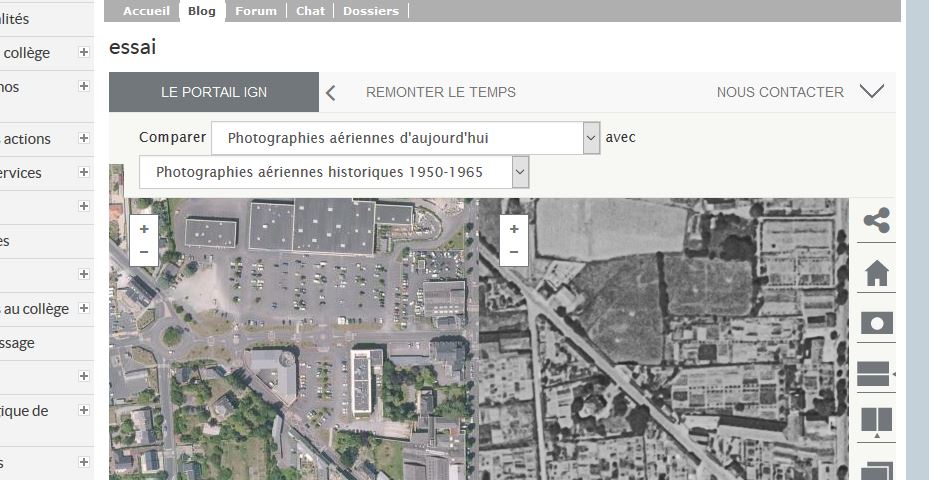 l'Institut National de l'Information Géographique et Forestière (IGN) vient de mettre en ligne un nouveau service « Remonter le temps » qui est d'un grand intérêt pédagogique. Cartes et photographies aériennes, de différentes époques peuvent être combinées, comparées grâce à trois modes de visualisation différents.