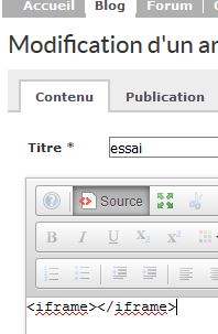 Lors de la création d'un article, cliquer sur le bouton "code source" et taper <iframe></iframe>.