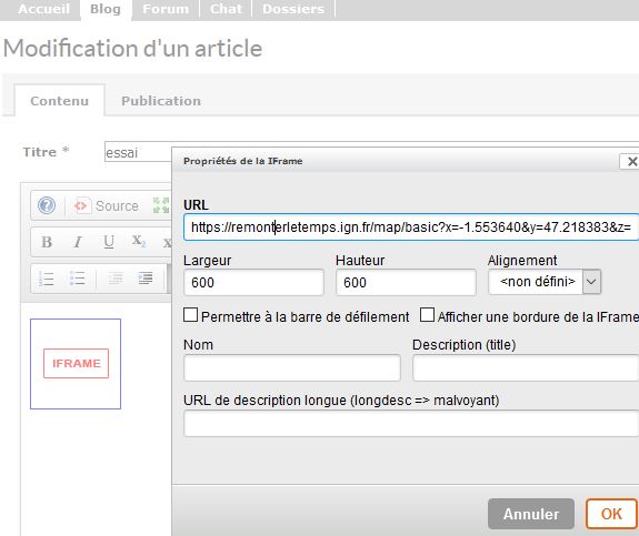 Le bouton "code source" est décoché et un clic droit sur l'affichage Iframe permet d'accéder à un menu. Il convient de renseigner l'URL résultant du bouton "Partager" du site Remonterletemps et d'indiquer la largeur et la hauteur de la fenêtre d'affichage sous e-lyco.