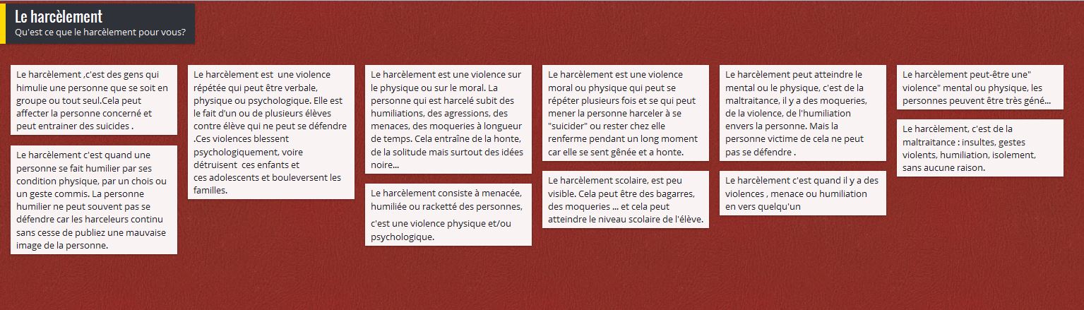 - lors de la journée de lutte contre le harcélèment à l'école (5 novembre), j'ai créé un mur et l'ai mis à disposition des élèves de 3è dans un article du blog de la classe. La veille, je leur ai demandé d'alimenter ce mur à la maison en y inscrivant ce qu'était le harcèlement pour eux. Au retour en classe, j'ai affiché le mur qui a servi de support de discussion. Les élèves peuvent, mais ne sont pas obligés, indiquer leur identité avant leur commentaire.