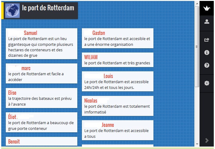 - En introduction à la séquence sur les ports et les littoraux en 4è, j'ai créé un article dans le blog de la classe dirigeant les élèves vers une vidéo promotionnelle du port de Rotterdam. A la maison, ils devaient visionner cette vidéo, et noter ensuite dans le mur chacun un mot ou une expression différente pour qualifier le port de Rotterdam. Au retour en classe, on visionne le mur et l'on dégage ainsi les grandes caractéristiques du port que la suite de la séquence permettra de préciser.